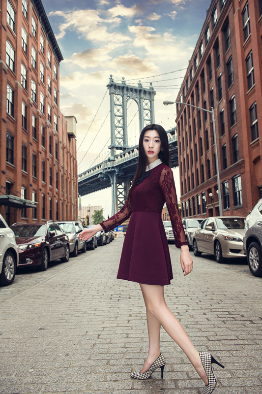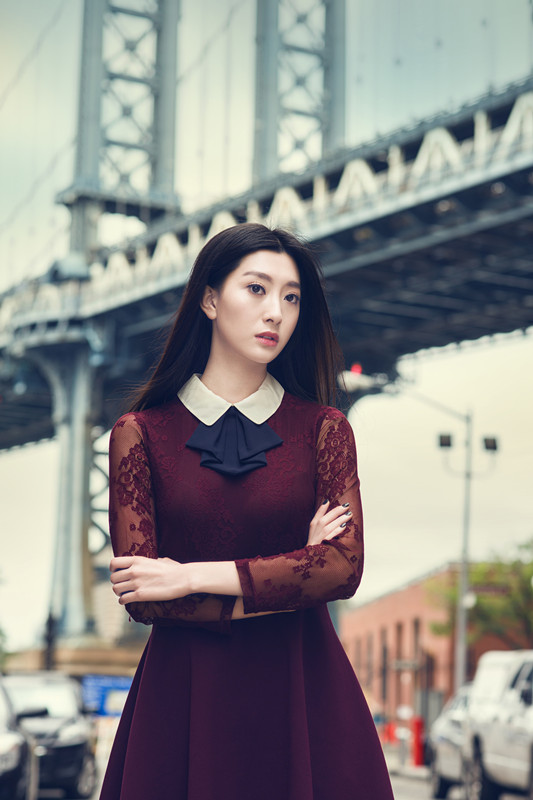 在光線(xiàn)的作用下,布魯克林大橋及周邊建筑物顯出長(cháng)長(cháng)的美妙陰影。從黃昏日落一直到璀璨燈海的夜景,酒紅色的連身裙搭配深色系外套,時(shí)刻透露出婉甸的溫婉與優(yōu)雅,與背景融為一體。經(jīng)典建筑與潮流時(shí)尚的結合,好似道時(shí)光列車(chē),留住了歷史,看見(jiàn)了未來(lái)。