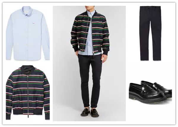 整套穿搭的主色調是藍色,用淺藍襯衫作底,外套和長(cháng)褲都選擇深藍以突出層次。