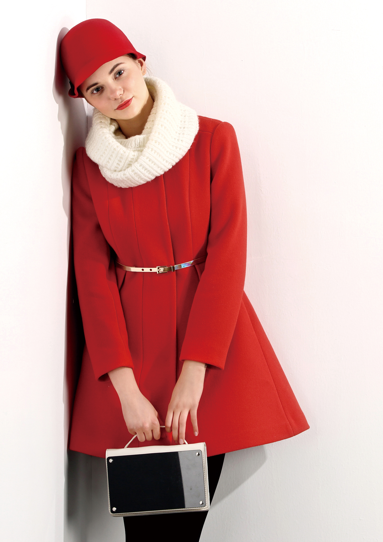 同樣是紅色,不同版型的大衣則演繹了另一番甜美淑女的風(fēng)情。同色系禮帽搭配外套凸顯甜美公主范兒,圍脖和手包的顏色一定要單純,為造型增加精致感。