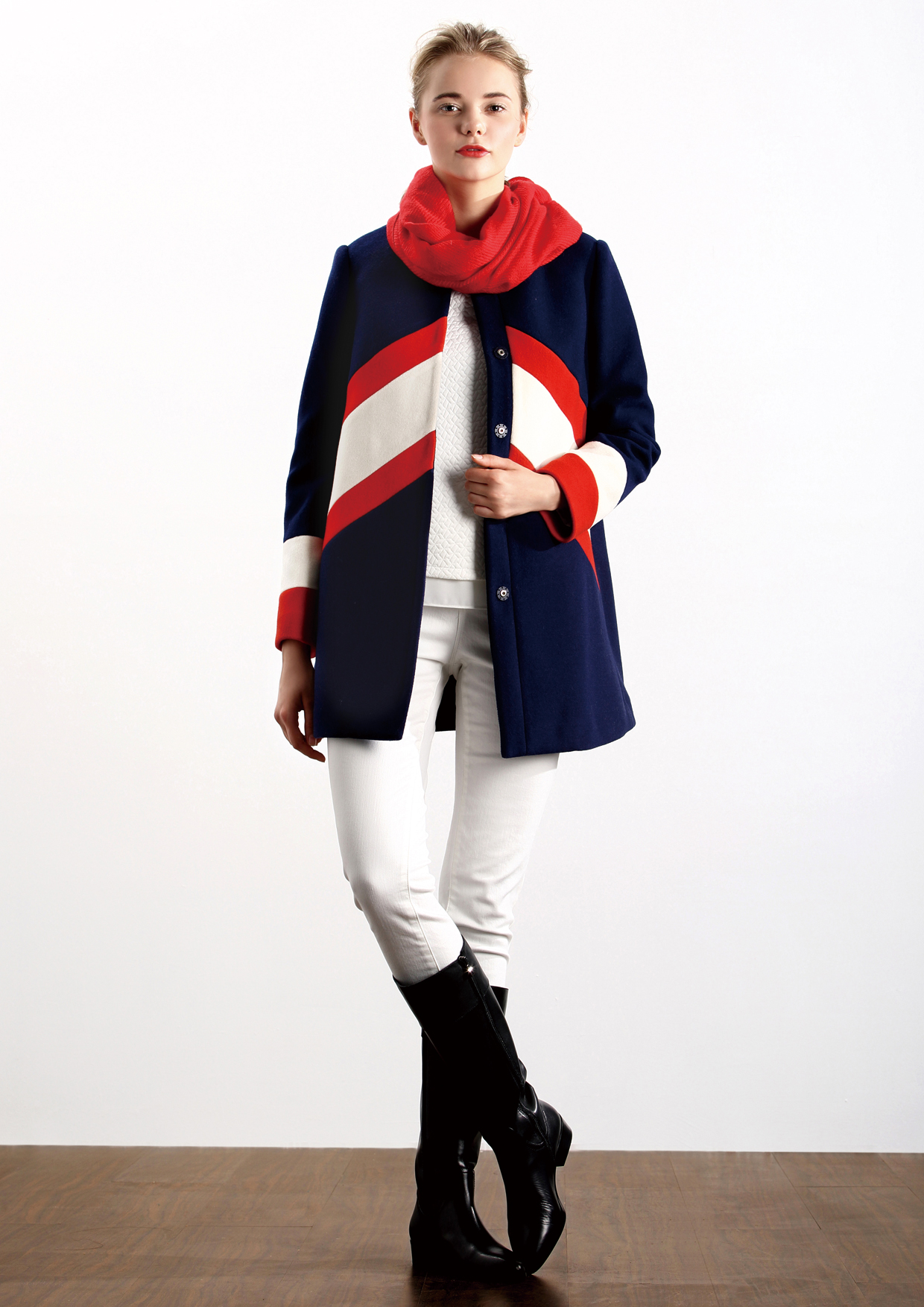 紅、白、藍色大色塊占據大衣醒目位置,對稱(chēng)簡(jiǎn)潔的分布營(yíng)造帥氣女生的氣場(chǎng),紅色圍脖和白色內搭、長(cháng)褲簡(jiǎn)簡(jiǎn)單單就讓人印象深刻。