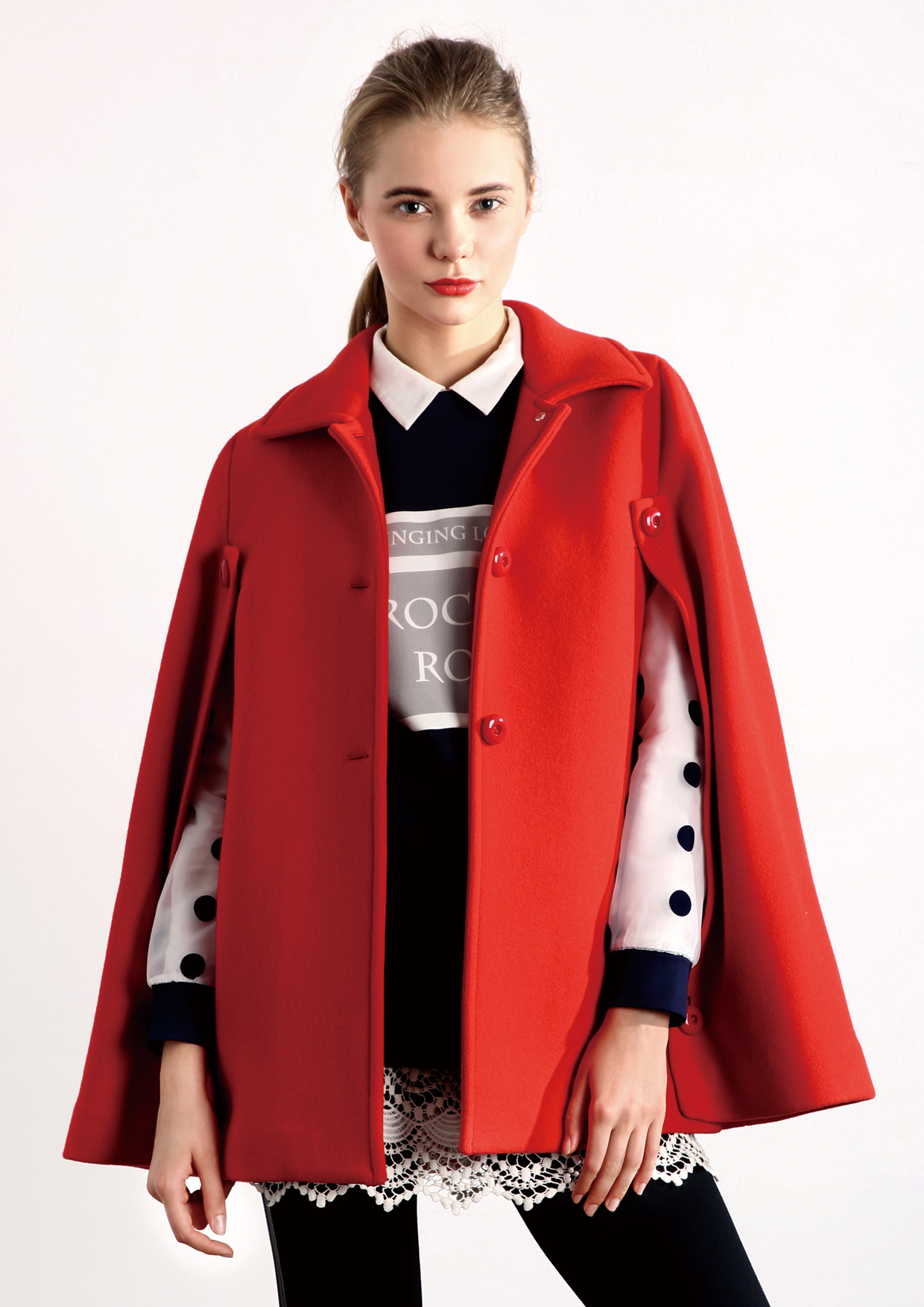 紅色的斗篷不僅造型帶有舞臺效果,色彩更是讓人過(guò)目不忘。內搭有襯衫領(lǐng)子的洋裝,凸顯鄰家女孩的親和力。